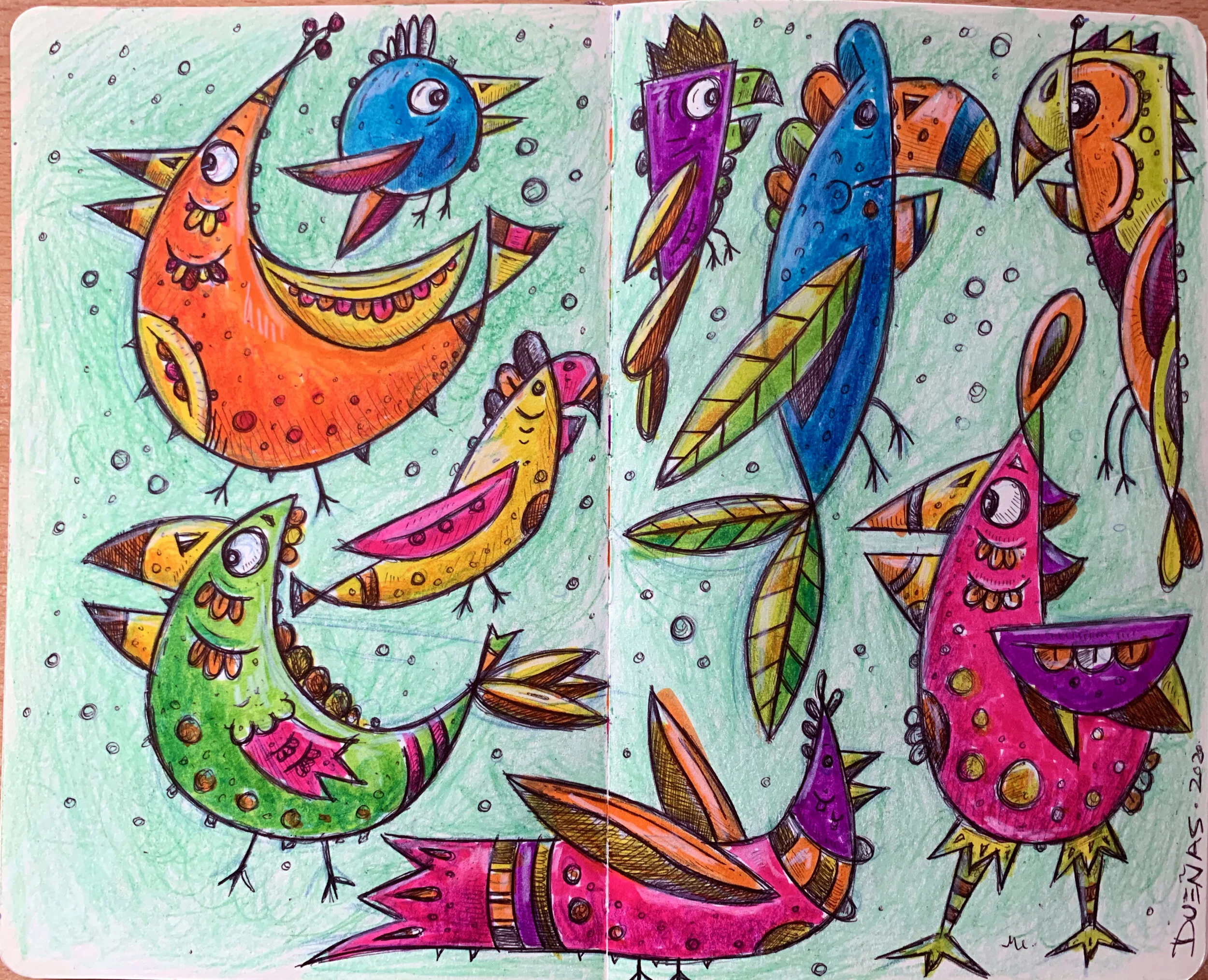LOS 9 PAJARITOS is a personal illustration series exploring a new visual style characterized by rough edges, bold forms, and textural dot patterns. The project allowed for creative experimentation with tone, technique, and composition—blending playful imagery with a handcrafted, organic aesthetic.